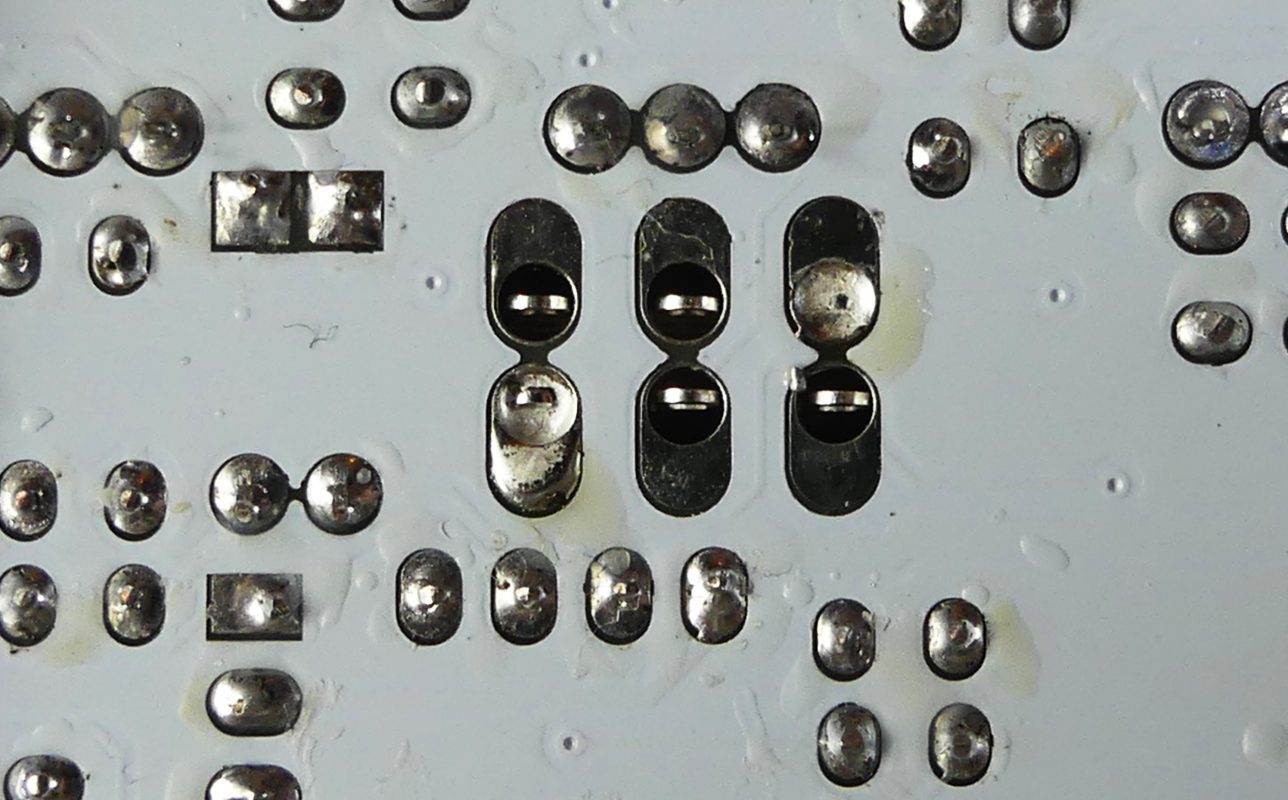 Apply a small amount of solder to two of the switch legs. Turn the unit over, if the switch appears to be wonky or rubbing against one side you can heat up one of the joints and apply light pressure to correct the alignment. Repeat for each switch until happy and then solder all the legs.