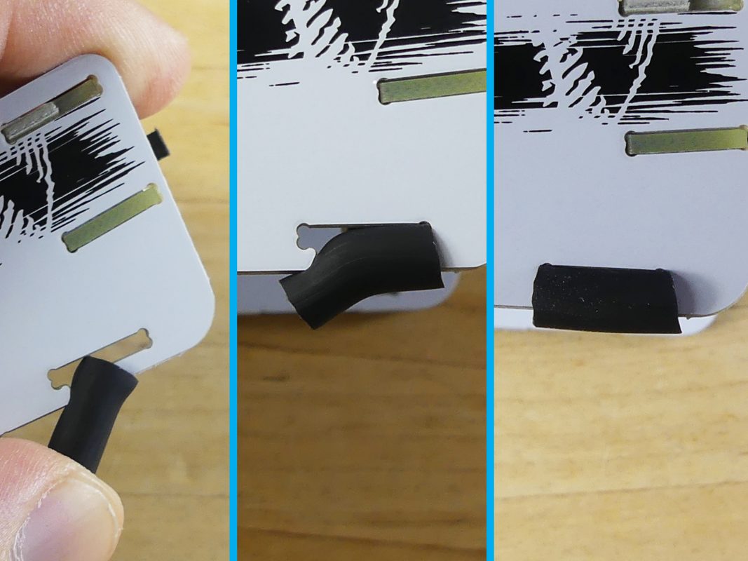 Install the feet by pressing the rubber tube onto the long section of the cut-outs on the bottom edge of each side panel.
