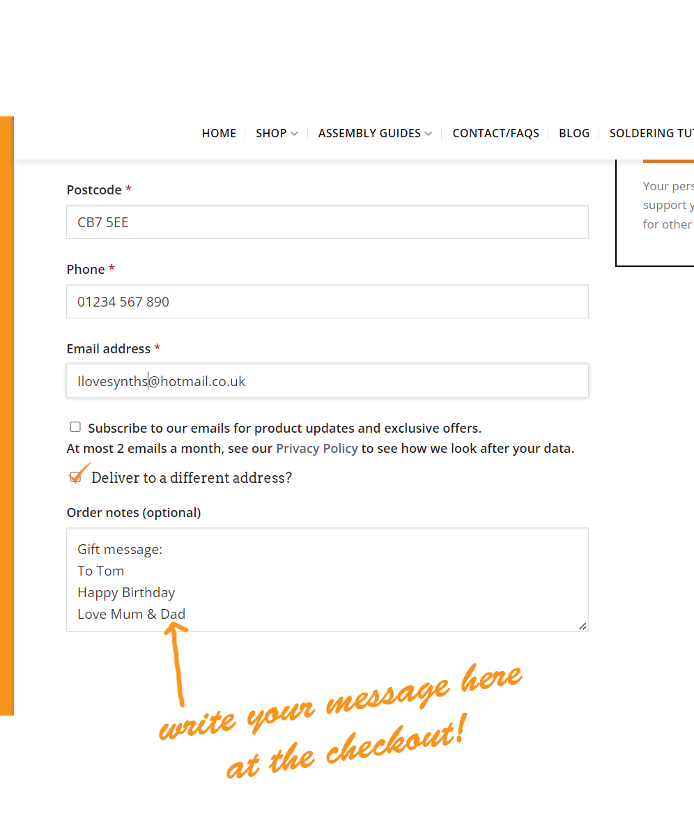 Write your gift message in the ‘Order Notes’ section at the checkout, and send it to the recipients address by ticking the ‘Deliver to a different address’ button.